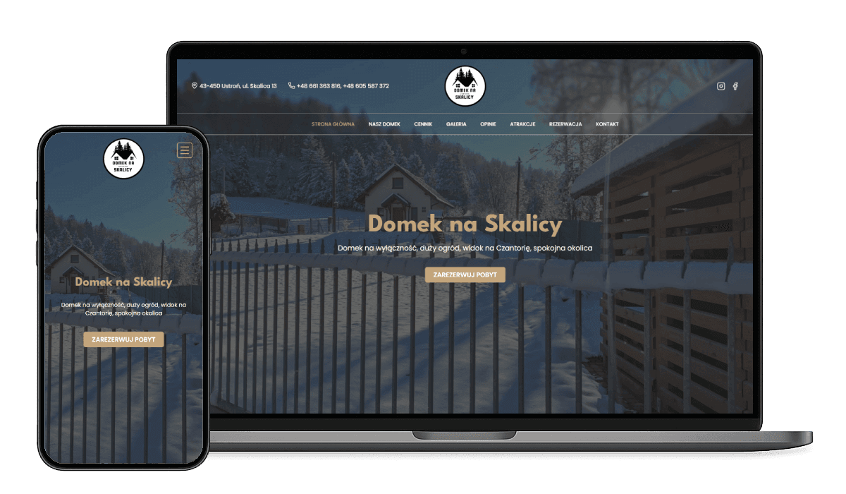 Strona internetowa dla Domku na Skalicy w Ustroniu, obejmująca przygotowanie projektu graficznego oraz kompleksową realizację serwisu. Nowoczesny, lekki i responsywny layout, z naciskiem na estetyczną prezentację oferty, galerii zdjęć oraz wygodny kontakt i rezerwację dla gości.